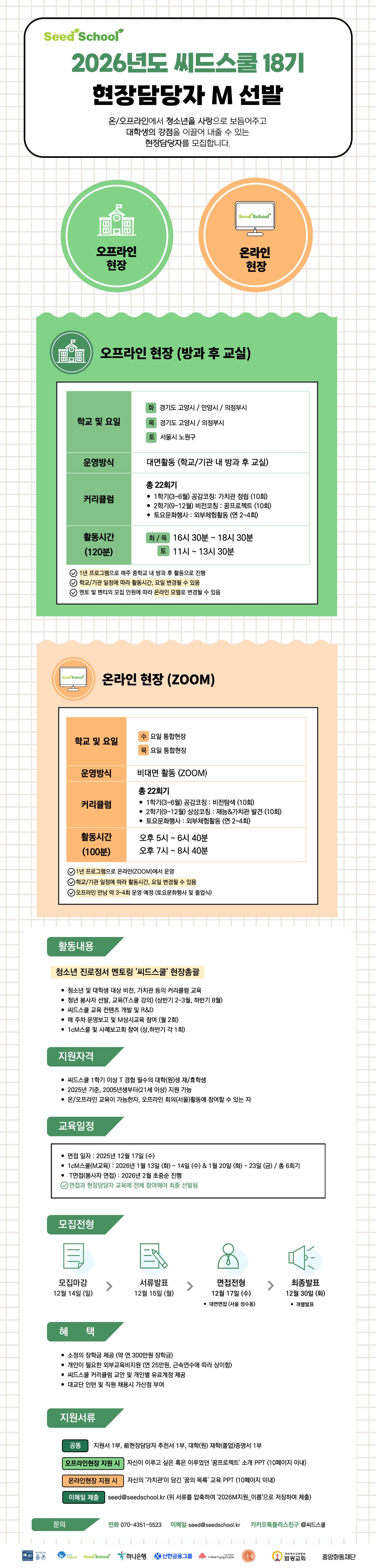 [모집공고] 2026년도 씨드스쿨 현장담당자 18기 M선발 (~12/14) 2025.12.01
