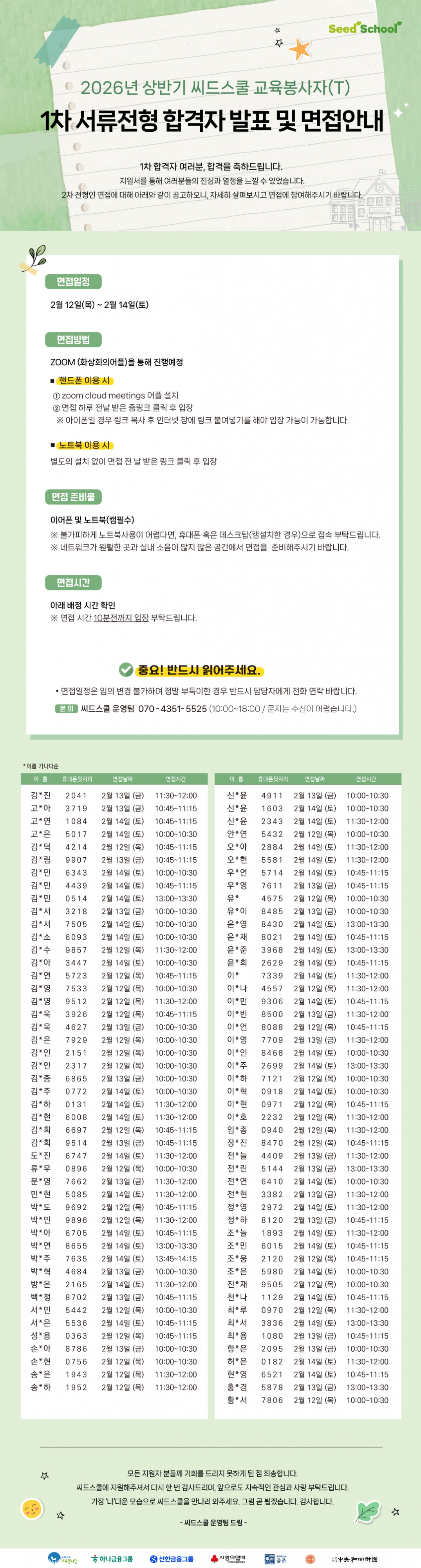 [면접안내] 2026 상반기 씨드스쿨 교육봉사자(T) 1차 서류전형 합격자 발표 및 면접안내 2026.02.10