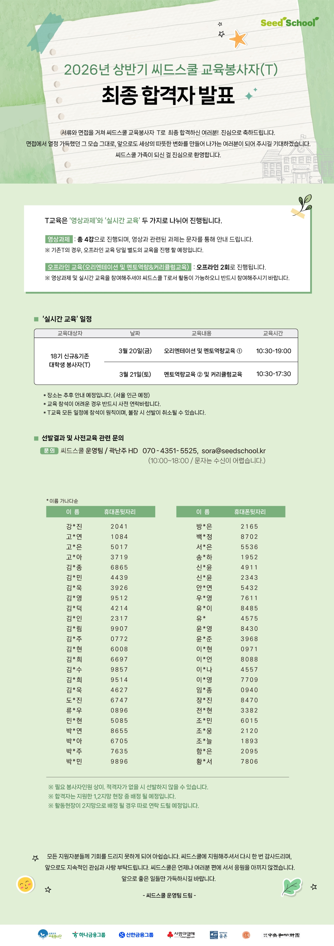 [선발공고] 2026년 상반기 씨드스쿨 교육봉사자(T) 모집 최종합격자 발표 2026.02.19