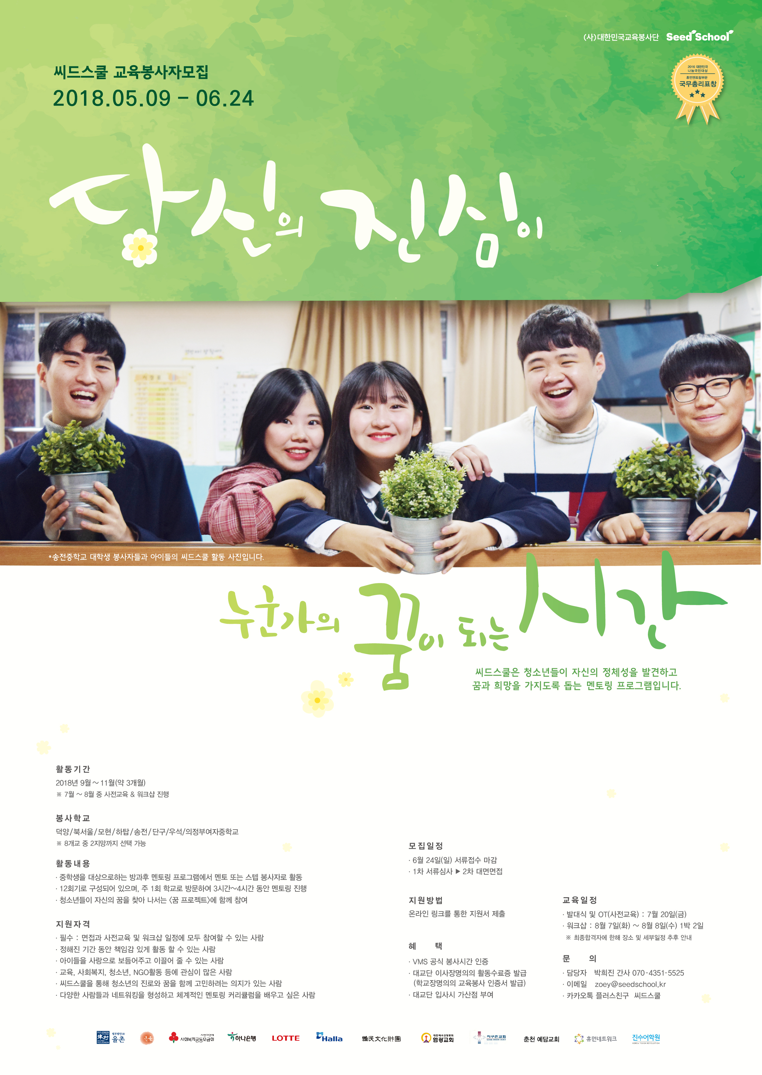 [모집공고] 2018 하반기 대한민국교육봉사단 씨드스쿨 신규 교육봉사자(T) 모집 (~6/24) 2018.05.04