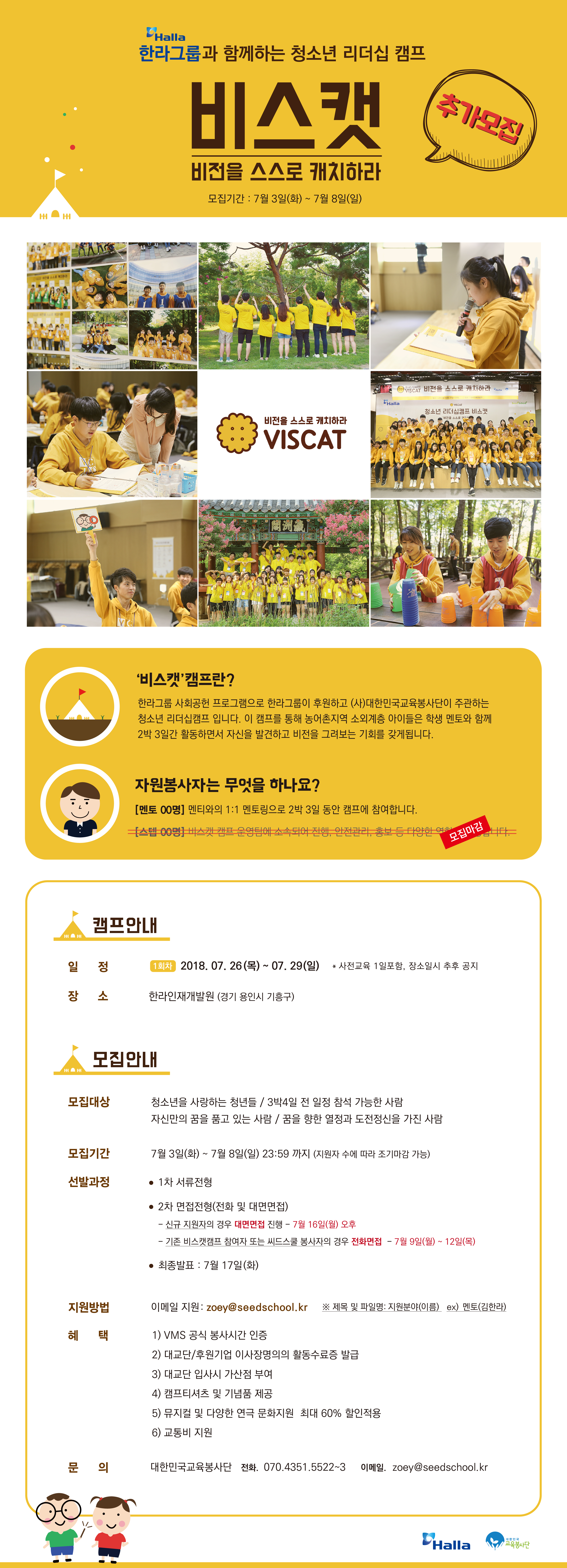 [모집공고] 한라그룹과 함께 하는 청소년 리더십캠프 '비스캣(VISCAT)' 자원봉사자 추가모집(~7/8) 2018.07.03