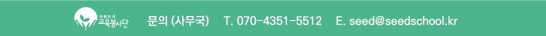 - 다음글 : [추가모집] 2023년 상반기 온/오프라인 씨드스쿨 교육봉사자(T) 추가모집(~2/10) 2023-01-17 15:07:10